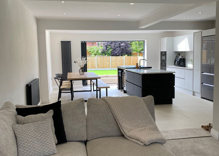 The project involved a significant transformation. We removed walls and added a rear extension to create a stunning open-plan kitchen and living area. Upstairs, we refurbished the bedrooms with elegant nude tones and new flooring, and we designed a pristine marble bathroom that adds a touch of luxury to the space.